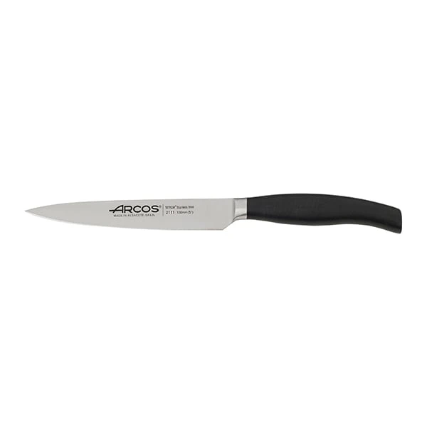 Ce couteau fabriqué en Espagne a une lame Nitrum. Cette composition exclusive déposée par Arcos est en acier inoxydable martensitique enrichi d’azote. Cela lui confère une meilleure dureté ainsi qu’une haute résistance à la corrosion. Ce couteau au fil parfaitement lisse et durable a un pouvoir de coupe élevé, il convient parfaitement à la découpe ou l’épluchage de gros fruits et légumes grâce à sa longue lame de 13 cm.