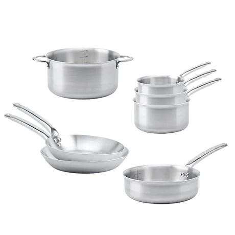 Ce lot comprend 3 casseroles de 16, 18 et 20 cm, de 2 poêles à frire de 24 et 28 cm, d’une sauteuse ainsi que d’un faitout. Conçus en inox 18/10 et fabriqués en France, ces ustensiles de cuisson sont robustes et résistent aux rayures et aux chocs. Dotés d’un fond multicouche 3-ply et de graduations intérieures tous les demi-litres (à l’exception des poêles), ils sont pratiques à utiliser au quotidien. Le fond permet une bonne conduction de la chaleur et a une forte réactivité pour une montée et descente en température rapide. Leurs poignées sont rivetées ; celles des casseroles, des poêles et de la sauteuse sont courbées à la française pour protéger vos mains de la chaleur.