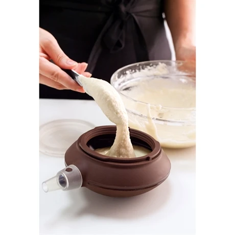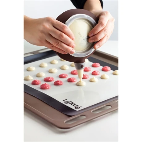 Avec sa maxi capacité de 350 ml, le Décomax est une pompe-stylo de décoration qui possède 6 embouts différents et s’utilise comme une véritable poche à douilles. Il autorise toutes les fantaisies : écrire et décorer gâteaux et assiettes mais aussi garnir des moules à cupcakes, des choux, profiteroles, macarons… Il suffit de remplir son réservoir de sauce salée ou sucrée (coulis, chocolat fondu, confiture, coulis, mayonnaise…) et de fixer l’embout.