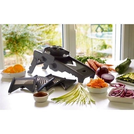 La mandoline s’utilise en position pliée au dessus d’un bol, où elle reste stable grâce à ses encoches. Elle sert aussi en position dépliée sur le plan de travail, bien calée sur ses pieds. L’épaisseur de coupe peut être ajustée de 1 à 9 mm.