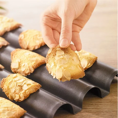 Les tuiles doivent cuire tout d’abord à plat sur une plaque plane, puis dès la sortie du four être placées sur la plaque à tuiles pour leur donner leur forme de tuile.