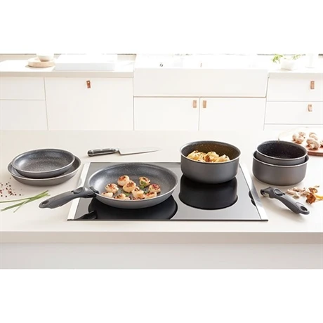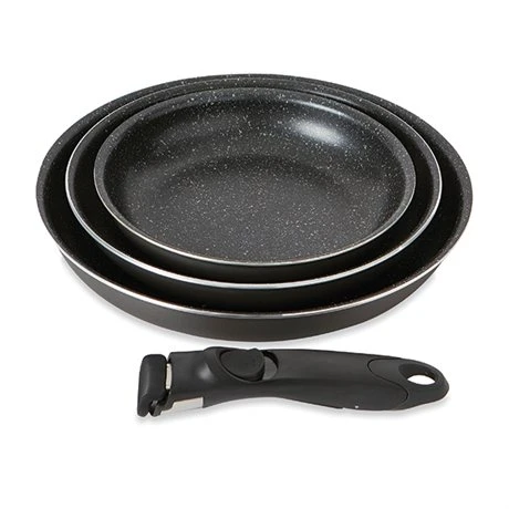 Leur revêtement extérieur gris foncé en fait un set de poêles très esthétique dans votre cuisine. Les poêles sont compatibles tous feux dont induction. Un manche amovible est fourni avec le set de 3 poêles.