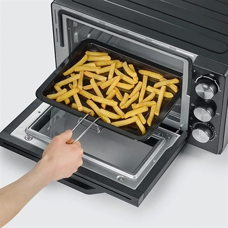 Compact et polyvalent sont les mots clefs qui définissent le mini four noir 20L avec puissance de 1380W TO2070 de chez Severin. Celui-ci convient pour les pizzas jusqu’à 28 cm de diamètre, les pâtisseries, les rôtis ou même les frites ! Son corps avec isolation thermique et sa façade en verre de haute qualité permettent de chauffer rapidement. L’interrupteur du mini four peut se positionner sur 4 positions : la position éteint, la position résistance de voûte, la position résistance de sol et enfin la résistance de voute et de sol. Cela garantit des résultats parfaits pour vos aliments. La température est réglable entre 100 et 230°C. Avec ce four, vous pouvez définir un minuteur jusqu’à 2 heures avec un signal sonore annonçant la fin du temps choisi. Selon votre type de cuisson, le four s’adapte à vos aliments avec ses 3 niveaux de hauteur pour la grille.
