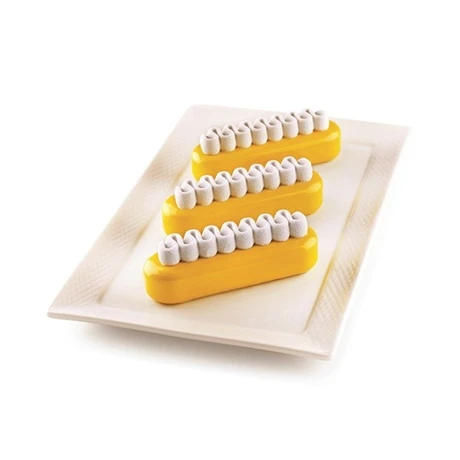 Le petit plus de ce moule, une plaque spéciale pour simuler un pochage zigzag élégant et précis à déposer sur le dessus de vos petits éclairs.