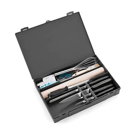 Le coffret rigide est modulable grâce à des peignes en polypropylène. Il possède 3 compartiments pour un rangement en vrac des ustensiles non fragiles (rouleau, spatules, douilles…) et un compartiment réglable en fonction de la longueur des lames, pour préserver les couteaux des chocs et les mains des blessures et les immobiliser. La sacoche et le coffret sont lavables et peuvent être tous les deux cadenassés.